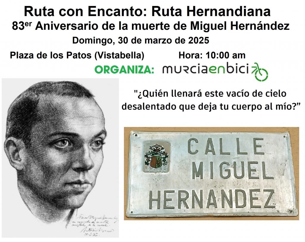 Antes de empezar la Semana Santa, hemos planteado una clásica dentro de Murcia en Bici, la Ruta con Encanto Hernandiana, consistente en la visita a los lugares más relacionados con Miguel Hernández en Orihuela, en el octogésimo tercer aniversario de la muerte del poeta. Los lugares son: