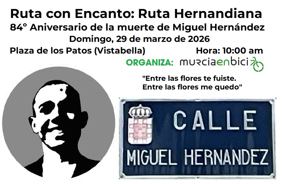 Antes de empezar la Semana Santa, hemos planteado una clásica dentro de Murcia en Bici, la Ruta con Encanto Hernandiana, consistente en la visita a los lugares más relacionados con Miguel Hernández en Orihuela, en el octogésimo cuarto aniversario de la muerte del poeta. Los lugares son: